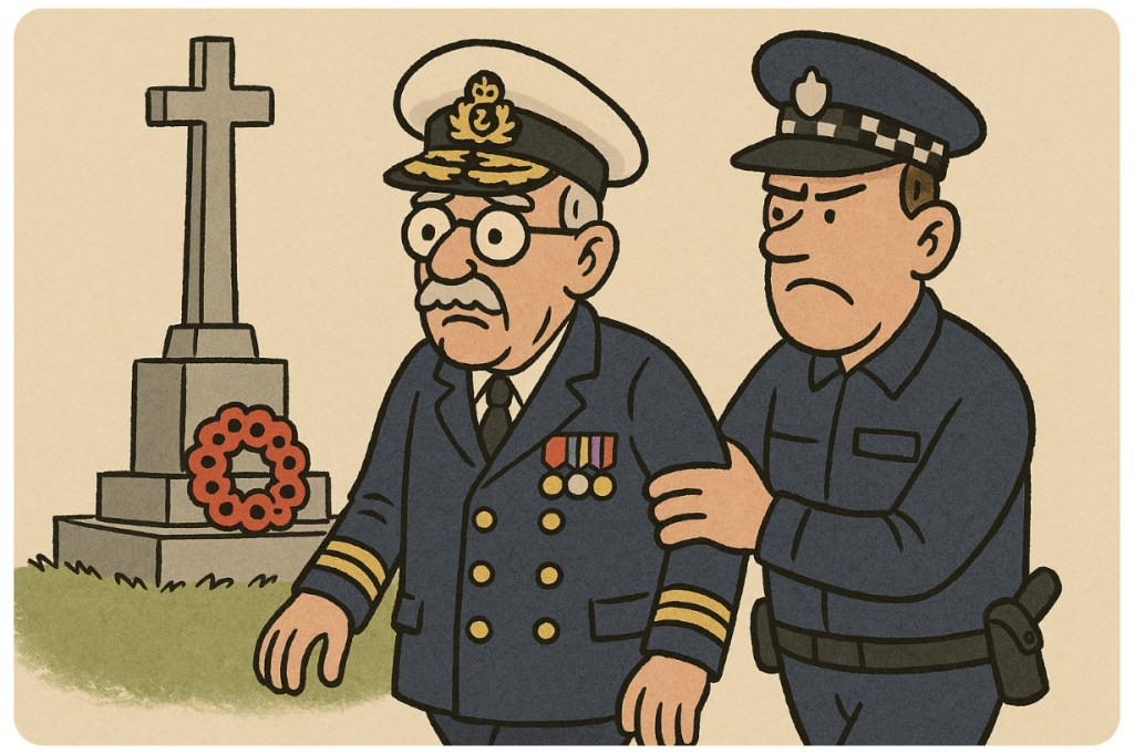 In a nation where actual war criminals host podcasts and sex offenders get suspended sentences, police have instead chosen to swiftly pursue… a retired teacher in cosplay. Yes, under the mighty force of the 1894 Uniforms Act—a law so dusty it predates Marmite—an elderly man was charged for impersonating a Royal Navy admiral during a Remembrance event. Because clearly, he is the greatest threat to public order. 👨✈️⚖️