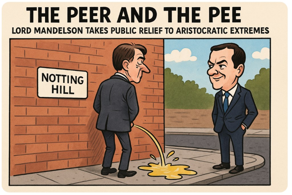 💦🚶♂️💼In a display of noblesse oblige nobody asked for, Lord Peter Mandelson, the velvet-voiced grandee of New Labour, has reportedly christened a Notting Hill wall with the full force of his bladder—mere moments after visiting none other than George Osborne. Ah yes, the modern-day Versailles: drinks with the architect of austerity, followed by a quick whizz on the plebs’ pavement. Who needs dignity when you’ve got a peerage?