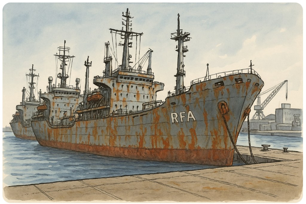 Because these once-proud support vessels are stuck in dock, crippled by age, rust, underfunding, and what we can only assume is a Ministry of Defence procurement system run by a bingo wheel and a half-blind seagull.
