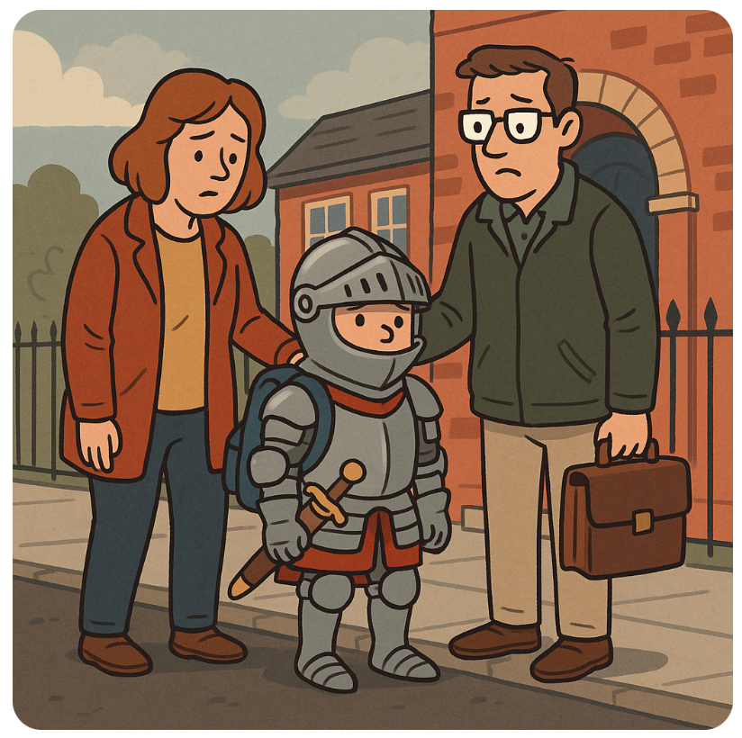 Because what child doesn’t dream of turning up to double maths dressed like a budget knight from a low-rent panto?