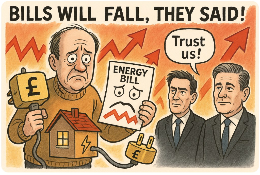 But let’s not forget the Conservatives—they’ve been in power for over a decade, meaning this isn’t an opposition problem, it’s a system problem. From price caps that are as useful as a chocolate radiator to green levies that somehow never green anything, it’s clear the entire “market” is rigged like a fairground claw machine. 🎡