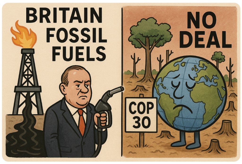 🌍💨While the Earth gently fries and island nations build escape rafts from driftwood, Britain is busy pressing “play” on its fossil fuel mixtape — and COP30? Oh, they’re too busy agreeing to disagree, one tree stump at a time. 🤝🌳✖️