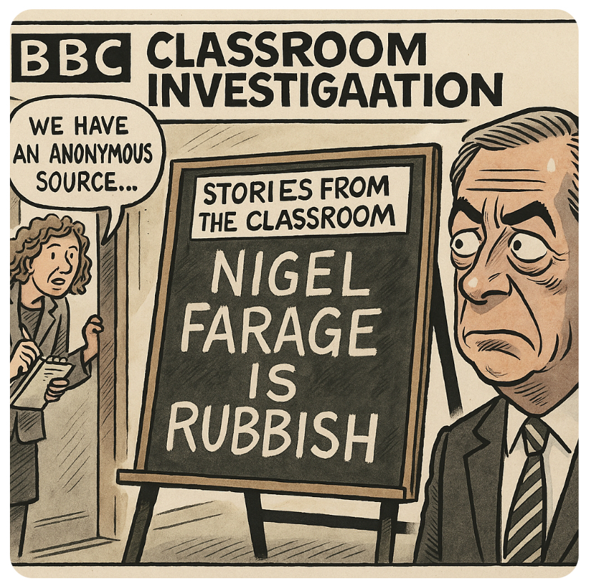 The BBC, in its infinite wisdom, has apparently decided that the most pressing newsworthy venue in Britain… is your local Year 10 classroom. Not NHS waiting times, not the housing crisis, not the climate time bomb—but Nigel Farage and his mythical reign of terror as discussed by 14-year-olds in between PE and detention.