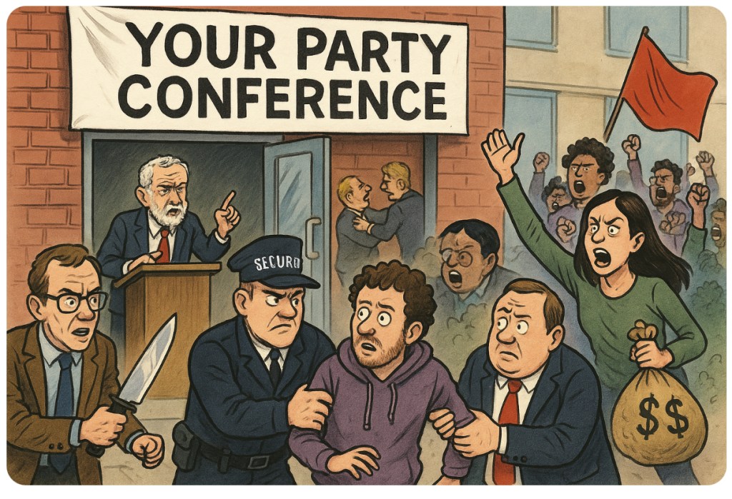 You know it’s serious when even Corbyn can’t keep the peace — the man who once calmed a warzone with a mug of herbal tea and a copy of The Morning Star. His speech on unity was so out of sync with the venue’s energy, you’d be forgiven for thinking it was AI-generated from old Stop the War PDFs.