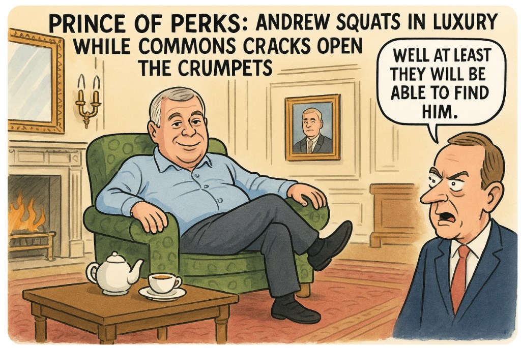 He may dodge the spotlight like it’s serving subpoenas, but don’t worry—when it comes to grilled sausages and taxpayer-funded palaces, Andrew is miraculously home. The same man who couldn’t recall whether he sweat (or allegedly did a whole lot more) in a PizzaExpress now faces being summoned by MPs to explain why he’s still occupying a royal Airbnb that makes Downton Abbey look like a Travelodge.