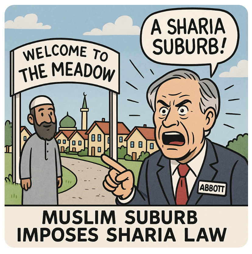 So let’s get this straight: a group of American Muslims proposes a housing development. No bulldozers. No building permits. No infrastructure. Just blueprints. And yet, it somehow inspires Texas officials to have full-blown Constitution-themed heart palpitations. Abbott practically accused them of erecting a theocracy with cul-de-sacs, as if HOA rules are going to be rewritten in Arabic.