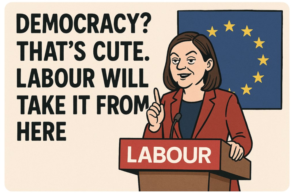 Labourβs new motto seems to be: βYouβve had your say, now kindly sit down while we decide whatβs best.β Forget referendums, forget that messy βwill of the peopleβ stuff β apparently, entrusting voters with major decisions is like letting toddlers pilot a 747. Dangerous, noisy, and not great for Brussels.