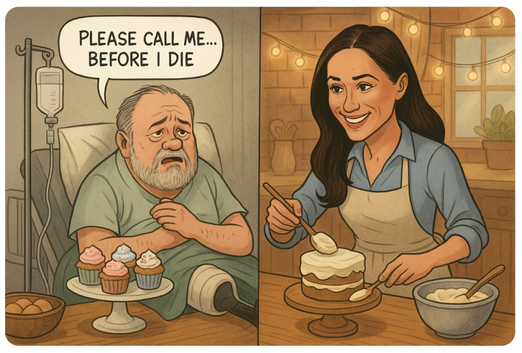 🎂📵Thomas Markle, freshly out of life-or-death surgery with a leg amputation, made a teary-eyed plea to his daughter Meghan: “Call me before I die.” But alas, the duchess was reportedly too busy styling cupcakes under fairy lights for her next feel-good baking bonanza.