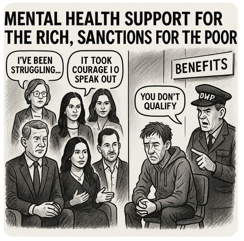 So here we are in 2025, where mental health awareness is now a luxury brand, paraded on TV by celebs and ex-royals while actual working-class people are told, “Snap out of it or lose your benefits.”