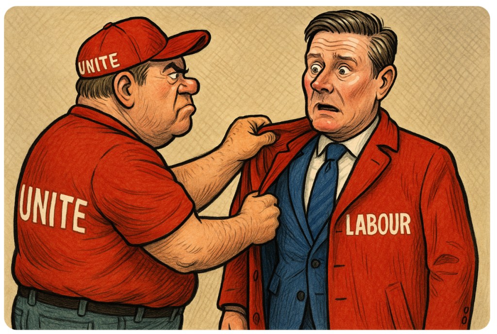 🚩🧥💙In the latest episode of Labour: The Cosplay Years, Unite—the party’s biggest trade union backer—is finally asking the question working-class voters muttered ages ago: What the hell are we funding? With Keir Starmer playing Tory karaoke in a red tie, the union that once pumped millions into the Labour machine is now eyeing the exit like someone who just realised they’ve been catfished by a manifesto.
