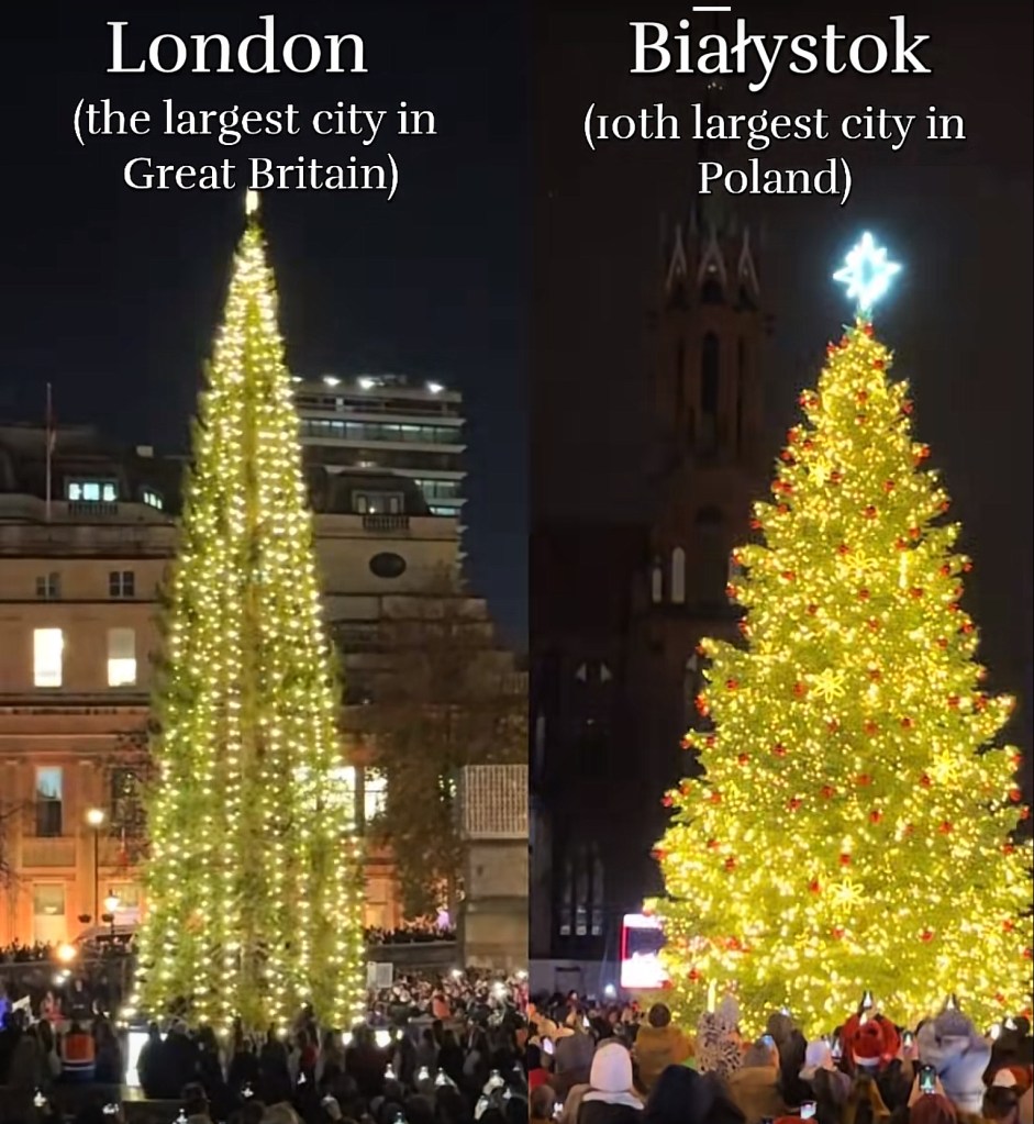 🌲💀In the red corner, we have Białystok, Poland’s 10th largest city, rolling up to Christmas with a tree so dazzling it could give the Northern Lights an inferiority complex. And in the blue corner… dear old London — the capital of Great Britain, armed with the world’s saddest tangle of lights draped over what looks like a traffic cone with seasonal depression.