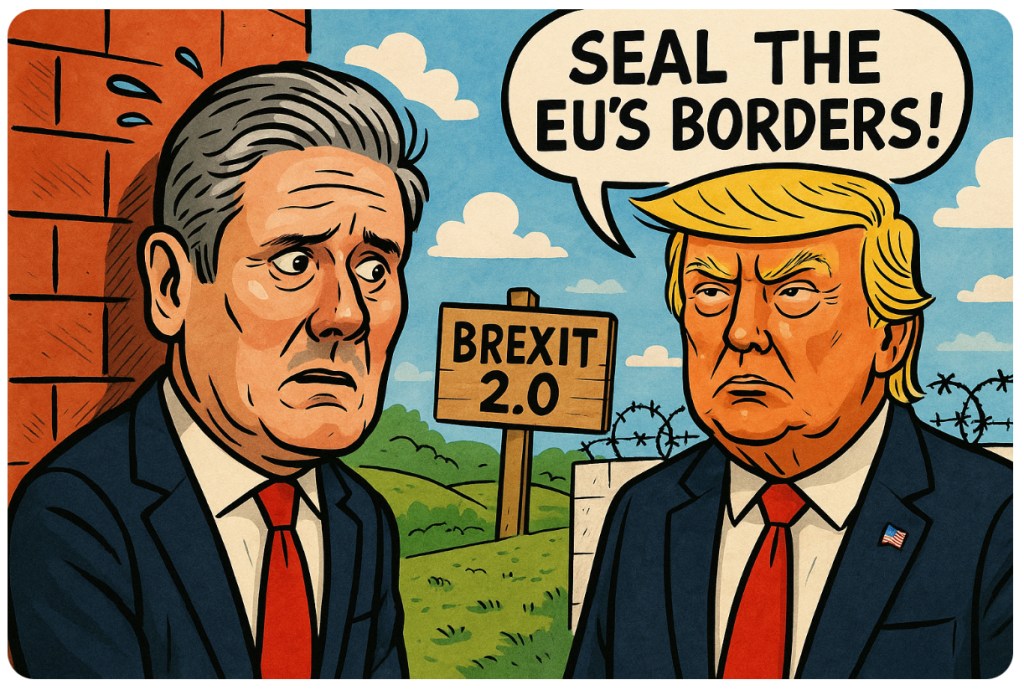 Just when Keir Starmer thought his biggest problem was explaining what he actually stands for, along comes an explosive leak โ and itโs very Trump-flavoured. According to Lee Cohenโs eyebrow-singeing scoop, Donald J. Trump is cooking up a Brexit 2.0 plan to slam the EUโs borders shut. And guess whoโs caught looking like a deer in the diplomatic headlights? Sir Keir, the man whose stance on Brexit is already more foggy than a Tuesday in Hull.