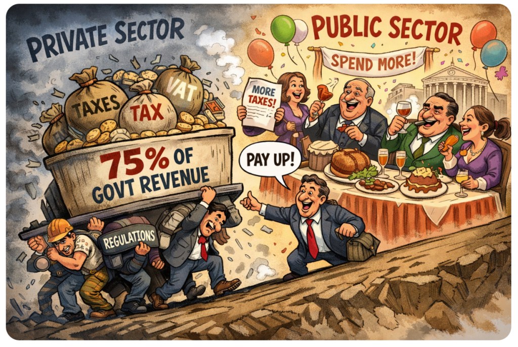 And yet — despite funding everything from potholes to pensions — the private sector wanders around with the political assertiveness of a dazed goldfish. No demands. No coordination. Just a shrug and a sigh as stealth taxes multiply like rabbits in a spreadsheet.
