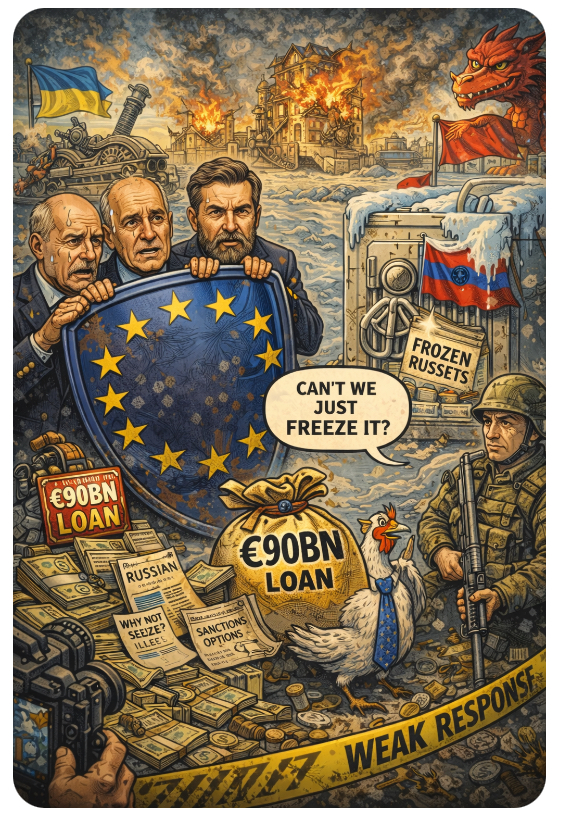 Instead of seizing aggressor assets, the EU has agreed a €90bn loan for Ukraine. A loan. Not reparations. Not confiscation. Not justice. Debt. Likely with interest. Because nothing screams “moral clarity” quite like invoicing the victim.