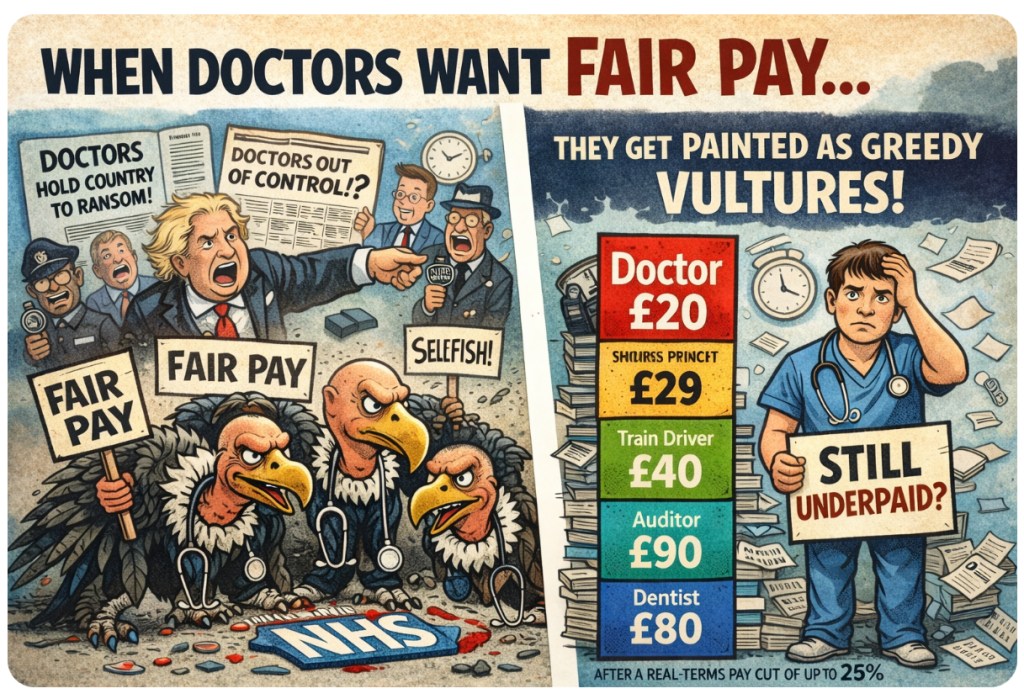 Doctors: saving your life one moment, getting slandered as salary-hungry saboteurs the next. In a stunning plot twist, the people who spent a decade training to diagnose your obscure rash in five minutes are now painted as public enemies… for wanting to afford heating.