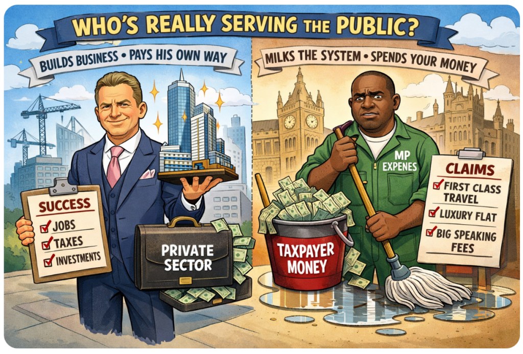 Nick Candy, for all the sneering aimed his way, doesn’t owe you a penny. He’s not your MP. He doesn’t claim expenses to speak on Question Time or take taxpayer money to do TED Talks. Lammy does. Candy builds homes for profit. Lammy builds narratives for applause.