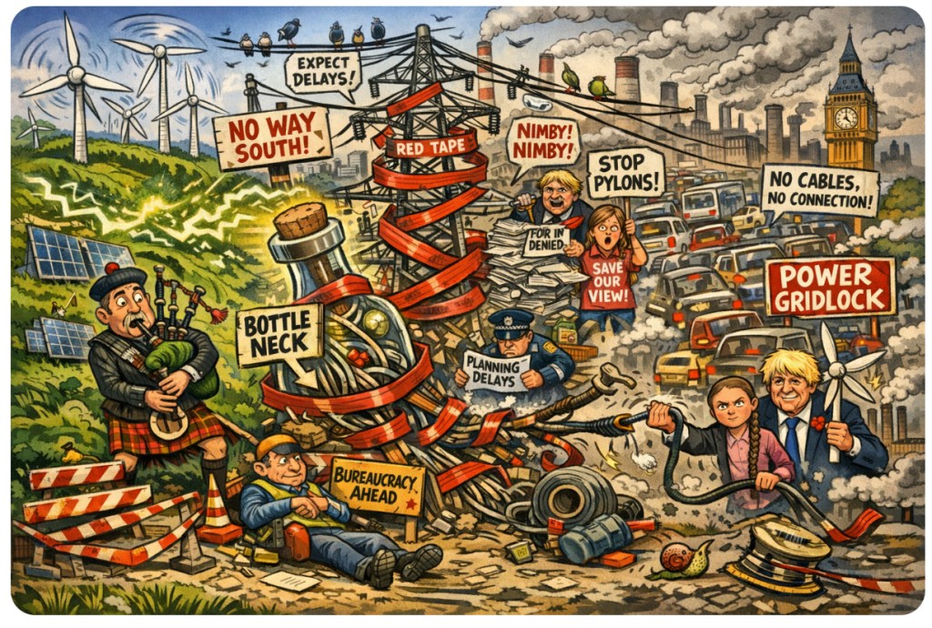 ⚡🚧Everyone’s blaming wind turbines, gas stoves, and Greta Thunberg’s side-eye—but the real reason the UK is dragging its carbon-soaked heels on Net Zero? Wires. Yes, actual wires. While Scotland churns out enough clean energy to power a guilt-free rave from Aberdeen to Brighton, it’s all getting bottlenecked faster than a Brexit border checkpoint.