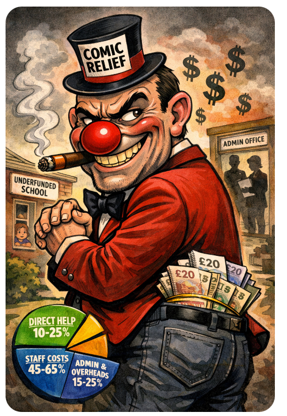 Itβs not all scandalβjust reality. This is how charity sausage is made. And Comic Relief, like many funders, doesnβt offer a single shiny stat to show how much really helps βchildren in the UK.β Why? Probably because that number would struggle to sell novelty noses in supermarkets. π