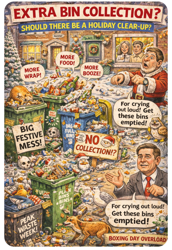 Instead of sending out the bin lorry with seasonal cheer, they often cancel a week and call it “efficiency.” So while the public drowns in Prosecco bottles and Amazon boxes, the council sends a polite reminder to flatten your cardboard and suppress your despair.