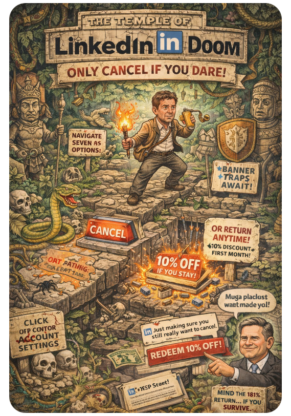 🧭💼So Ian’s canceled his LinkedIn Premium Career subscription—brave soul. But getting to that cancel button? That wasn’t a process. That was a booby-trapped psychological endurance test, brought to you by the world’s most professionally passive-aggressive networking site.