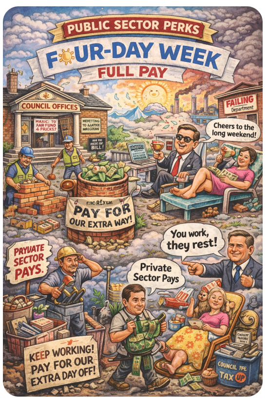 🛋️📆Britain’s councils want a long weekend—every weekend—and guess who’s footing the bill? That’s right: the brickies, the bakers, the bog cleaner-uppers. While your average private sector grafter is drowning in 50-hour weeks and rising bills, the public sector’s firing up the espresso machine for a leisurely three-day recharge. But hey—it’s all in the name of productivity (and pensions).