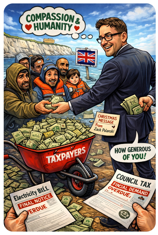 Polanski wants to show “compassion and humanity” to Channel migrants—which, on paper, sounds lovely, until you realise it’s being bankrolled by your heating bill. While the average Brit scrapes together coins to afford a litre of milk and a working boiler, Zack’s out here proposing a national emotional support fund.