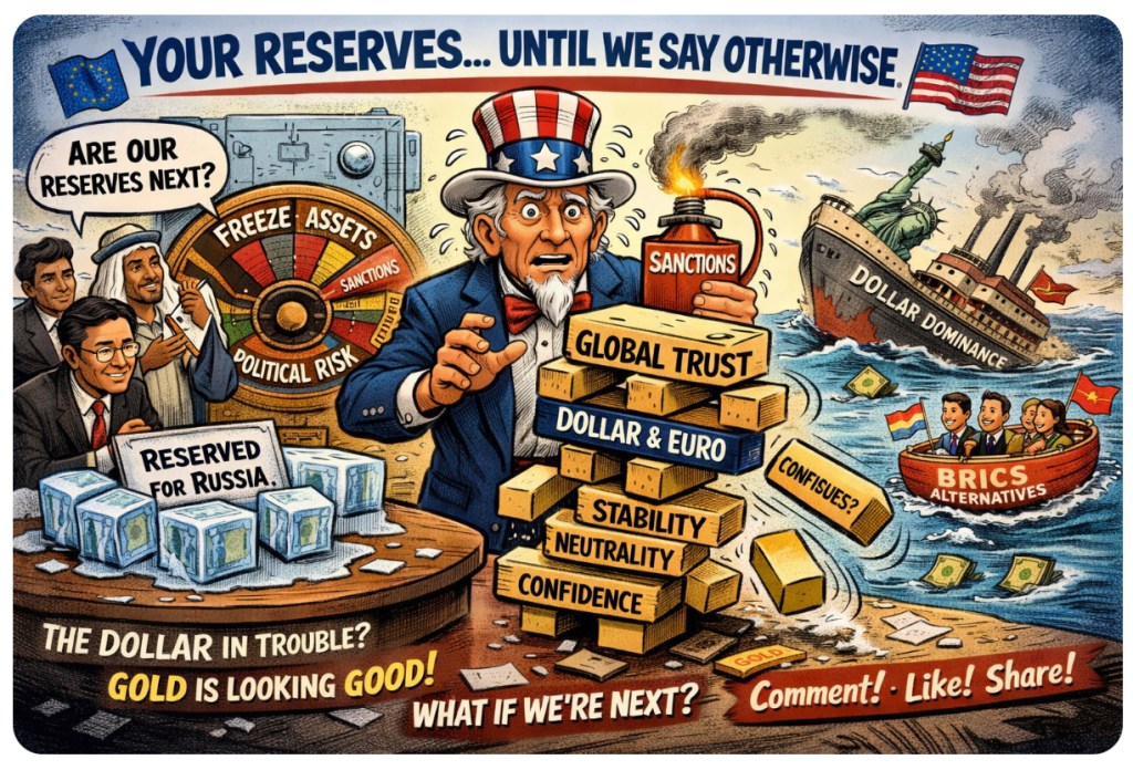 For decades, global reserves behaved like Switzerland on sedatives: calm, neutral, and untouched by politics. Countries—even rivals—parked trillions in USD and EUR because of one powerful idea: predictability. That idea just got nuked with the freeze on Russian assets. No court ruling. No confiscation. Just an executive pen and a geopolitical grudge.