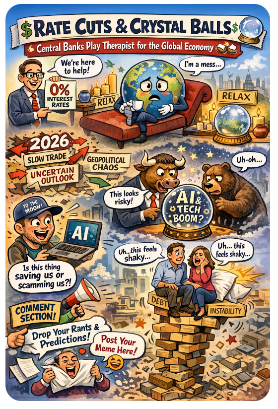 Central banks around the world have finally dropped the tough love act and started handing out interest rate cuts like tissues at a group therapy session. In the wake of post-pandemic whiplash, economic dΓ©jΓ vu, and enough geopolitical drama to make a Bond villain blush, 2025 became the year central bankers whispered, βItβs not you, itβs the interest rates.β As we hobble into 2026, the economic forecast looks more like a weather map drawn by toddlersβwith AI riding high and geopolitical tension simmering like an unattended Instant Pot.