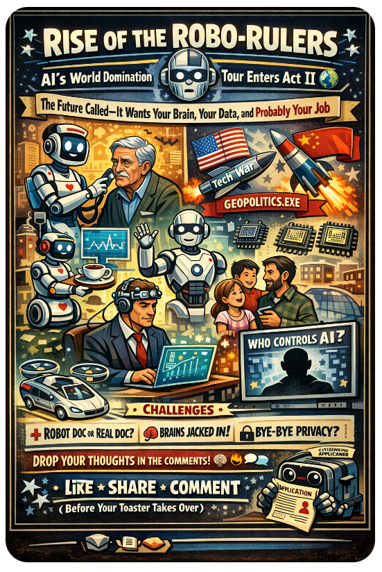 So yes, 2026 promises flying cars, thought-click interfaces, and robotic companionship. But also? Power grabs, privacy erosion, and a fun little game called βWho Governs the Algorithm?β (Spoiler: not you.)