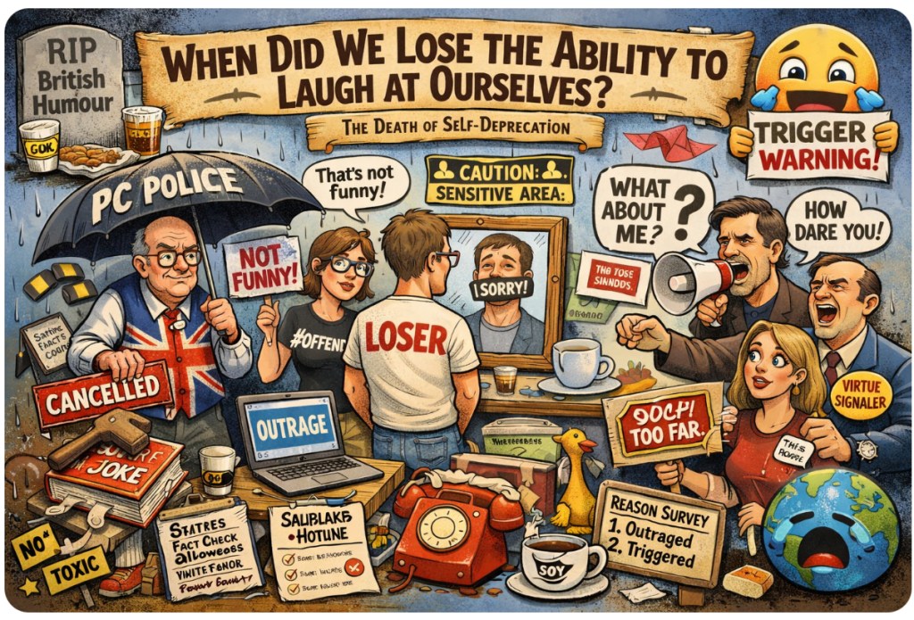 The art of self-deprecation wasnβt just humour β it was survival. Itβs how we dealt with war, Thatcher, and microwaved beans on toast. But now, everyoneβs either offended or professionally offended on someone elseβs behalf. Itβs like we replaced humour with a customer complaint form.