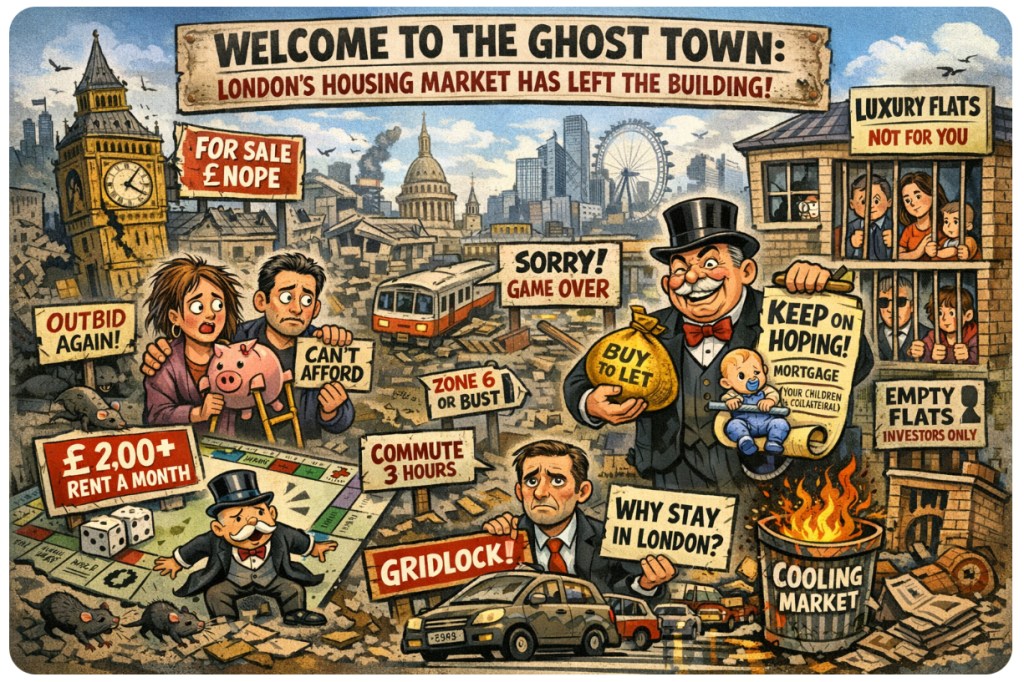 Let’s stop calling it a “market correction” when what we’re really witnessing is a structural faceplant. Picture a Monopoly board where all the properties are priced like Mayfair but the players earn in Monopoly Junior cash. That’s London. Buyers can’t buy. Sellers can’t sell. Developers can’t develop. Landlords can’t even pretend to be generous anymore. It’s not a cycle—it’s a silent standstill with a cocktail of dead momentum and broken dreams.
