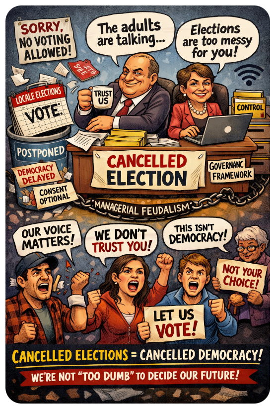 Β π³οΈπ«Local elections arenβt a courtesy. Theyβre the bare minimum of democracy. So when one gets yanked off the calendar like an overdue library book, itβs not just a clerical shrugβitβs a political snub with a smug grin.