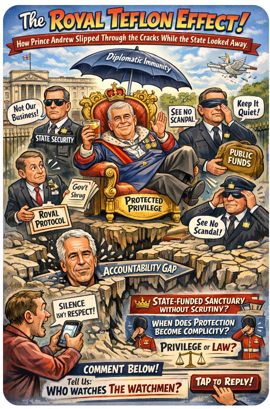 Prince Andrew’s saga isn’t just a tabloid tragedy starring one man’s catastrophic judgment. It’s a governance horror story, where the British state played butler, bouncer, and blindfolded referee — all in the name of “protocol.” This wasn’t a scandal hiding behind palace walls. It was one cushioned by government-grade insulation, fueled by public funds, and glazed over with a thick royal varnish of plausible deniability.
