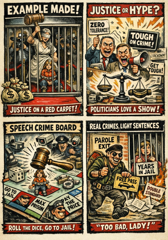 And yet? A multi-year custodial sentence. Not a caution. Not a fine. Not even a suspended sentence. She got the judicial version of a hammer to crack a peanutβbecause, apparently, Britain needed an example.