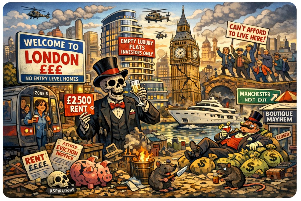 Let’s face it: London is starting to feel like a beautiful corpse. Glossy on the outside, hollow on the inside. For every foreign investor buying their fourth penthouse in Zone 1 they’ll visit twice a year, there’s a nurse commuting 3 hours because she can’t afford to live within 30 miles of her hospital.