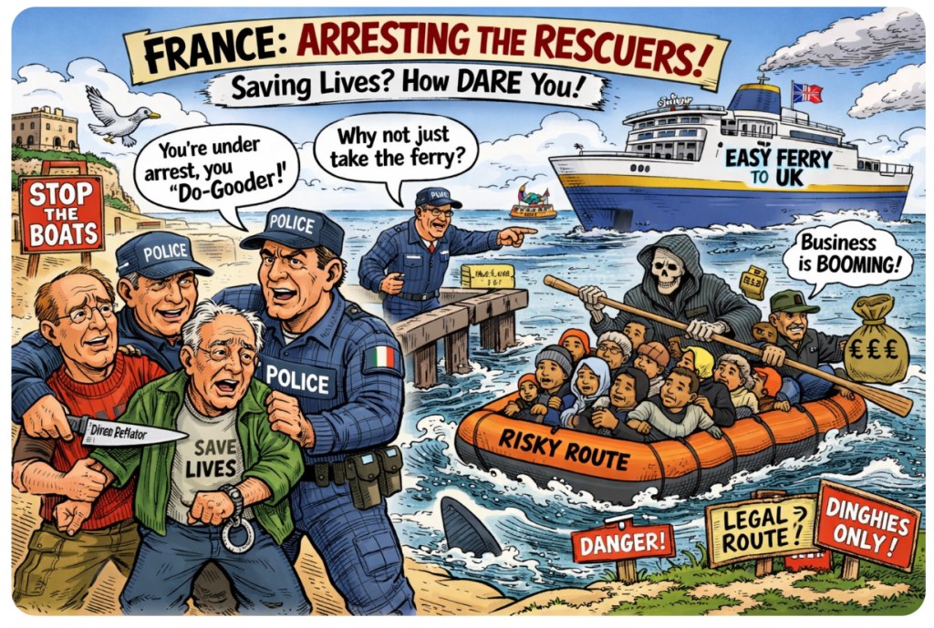 The French, in an inspiring act of strategic confusion, have decided that saving lives = sabotage. Meanwhile, both the French and British governments are playing a high-stakes game of βnot itβ with human lives, while the sea swallows another few souls who couldnβt afford a ticket to apathy.
