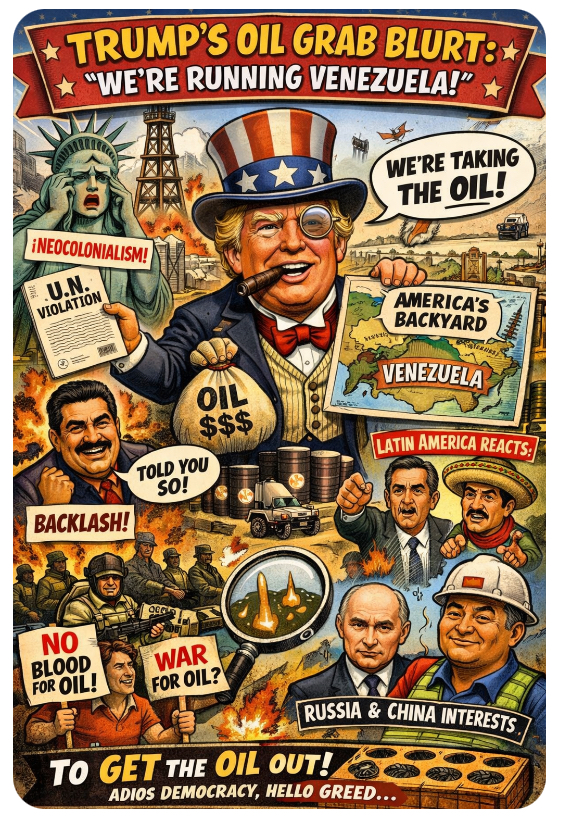 🎙️🤦♂️You can almost hear the ghost of Theodore Roosevelt cackling. Trump’s statement — a linguistic Molotov cocktail hurled at international law — takes the cake, the oil, and the last shred of plausible deniability. No longer is U.S. involvement in Venezuela “about democracy” or “humanitarian aid.” Nope. It’s about siphoning oil like it’s a free Slurpee at a global 7-Eleven. 🇻🇪⛽