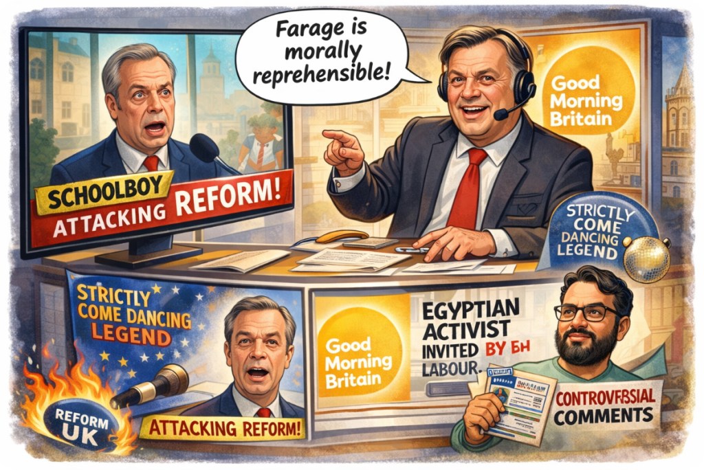 While the country faces crumbling services, spiralling immigration, and a Westminster class that couldn’t run a bath—Good Morning Britain has decided its top priority is… repeatedly slapping Nigel Farage with schoolboy quotes. Meanwhile, Labour waltzes in an Egyptian activist with a history of actual socially grotesque rhetoric, and the media? Crickets. If Farage sneezes near a microphone, it’s a scandal. If Labour invites someone who makes misogynists blush? Meh. Move on. It’s Tuesday.