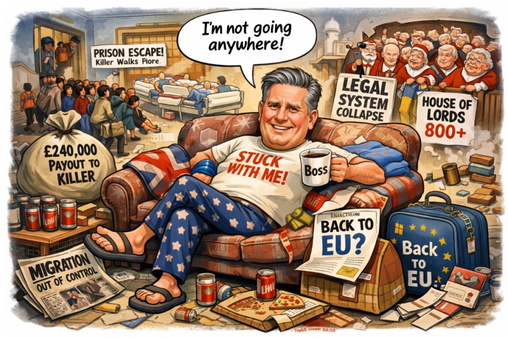 Imagine a housemate who crashes on your couch uninvited, eats all your food, sets fire to the carpet, then smugly declares, “You’re stuck with me now.” That’s Keir Starmer—Britain’s unwanted lodger-in-chief. From exploding migration numbers to NHS chaos, he’s upgraded the national mood from “mildly depressed” to “permanently stunned.” But don’t worry—he’s got big plans, like handing out quarter-million-pound hush money to convicted killers and maybe rewinding history by dragging us back into the Brexit battlefield. Fun!