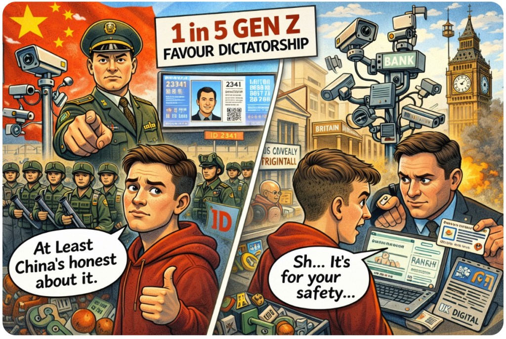 Nearly one in five Gen Z Brits flirting with the idea of dictatorship sounds shocking—until you remember they’ve grown up being watched, tracked, logged, nudged, and “algorithmically protected” since birth. To them, democracy doesn’t feel free. It feels monitored with better branding.