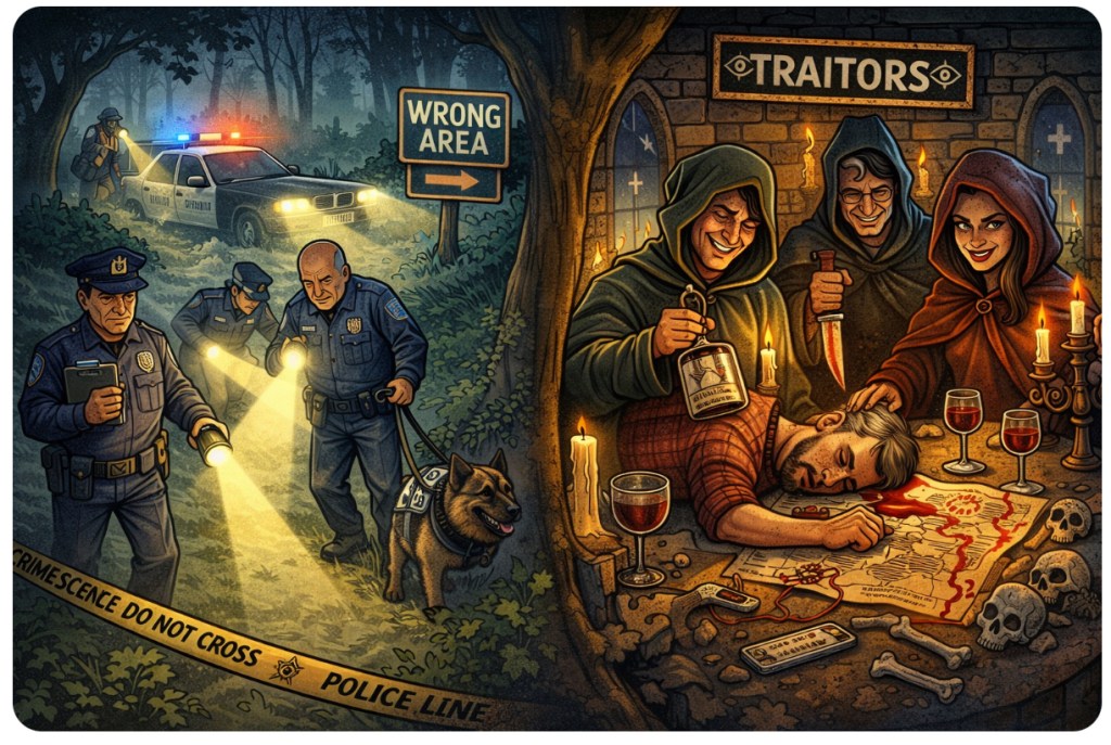 🕵️♂️🔪Welcome to the only reality show where the plot twists are so ironic, they practically creak under the weight of poetic justice. Max—the ex-policeman turned contestant—just got “taken out” by The Traitors. And now? A murder investigation… led by another ex-policeman. Because apparently, the only way to solve crime on this show is to retire first.