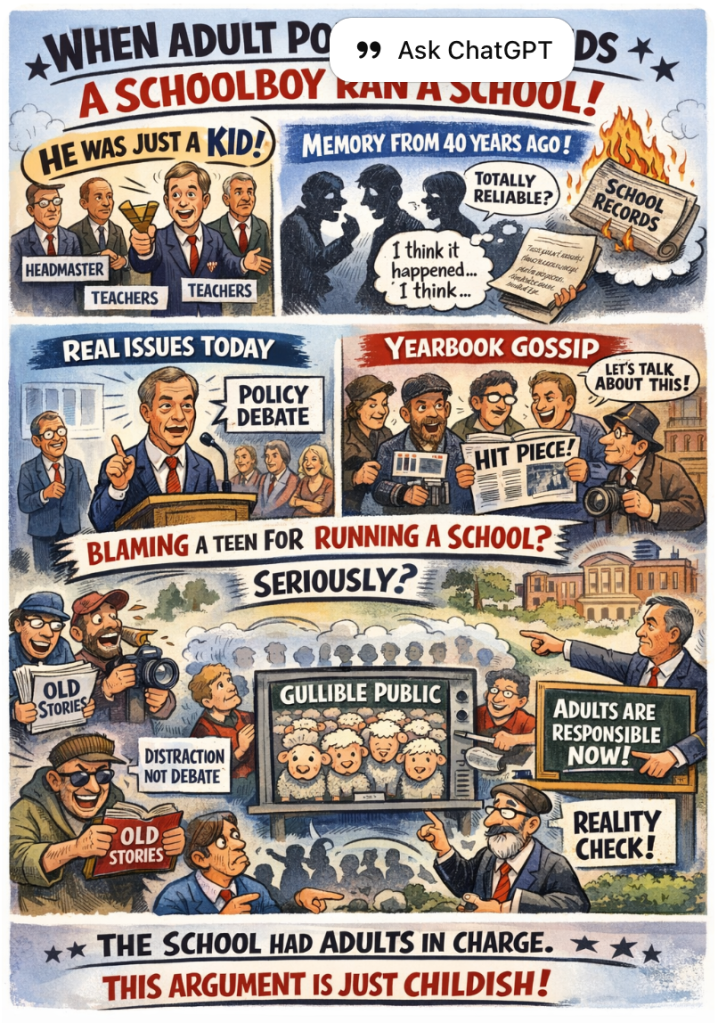 There are many legitimate ways to criticise a public figure: their policies, their voting record, their alliances, their rhetoric as an adult wielding power. What is not legitimate—nor remotely credible—is attempting to construct a political indictment out of playground anecdotes from more than forty years ago, and then treating those anecdotes as if they reveal something decisive about the governance of a school or the moral architecture of a nation.