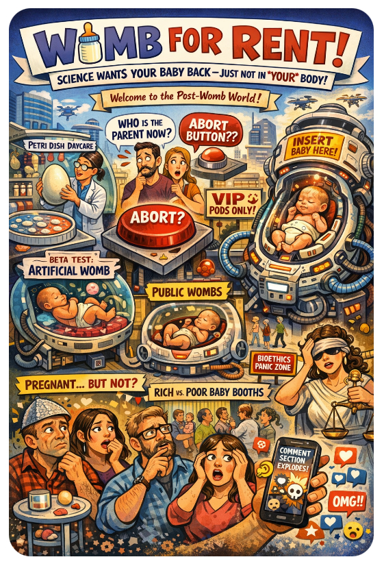 We already harvest eggs like ripe peaches 🍑. Sperm swims in petri dishes daily like it’s auditioning for Finding Nemo. Embryos get cultured in labs, and premature babies now survive at stages where Victorian doctors would’ve just offered a polite shrug and a shovel.