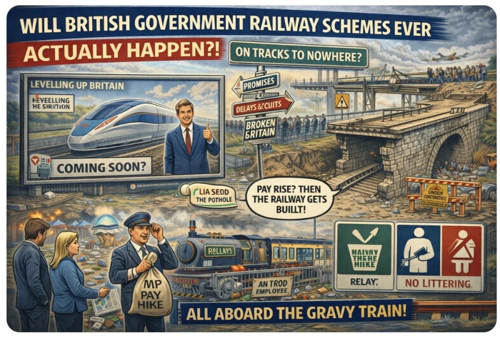 Let’s face it: British rail promises are the political equivalent of assembling IKEA furniture with no screws, no manual, and half the parts missing. Big on ambition, zero on execution. Until a civil servant’s pension depends on finishing a platform, or an MP’s bonus requires building an actual bridge, we’ll just keep riding the train of delusion — delayed, over budget, and calling at all the usual lies.