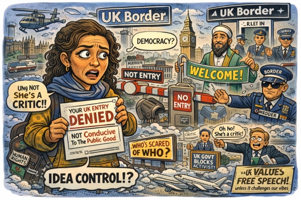 🛂🚫Apparently, “conducive to the public good” is just British bureaucrat-speak for “you made us uncomfortable.” Welcome to Fortress Britannia, where human rights activists get blocked at the border, and ideological hypocrisy gets a free pass.