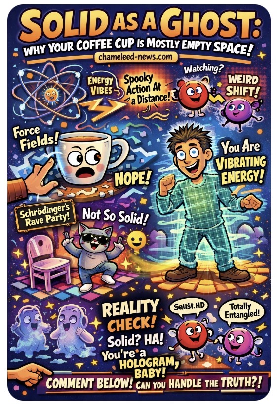Can you handle the truth? Or does your brain prefer the cozy lie of “stuff being solid”? 🪑💨 What does it mean for you if you’re basically a sentient storm of organized vibration? Sound off in the blog comments and help us rewire what we think is “real.”