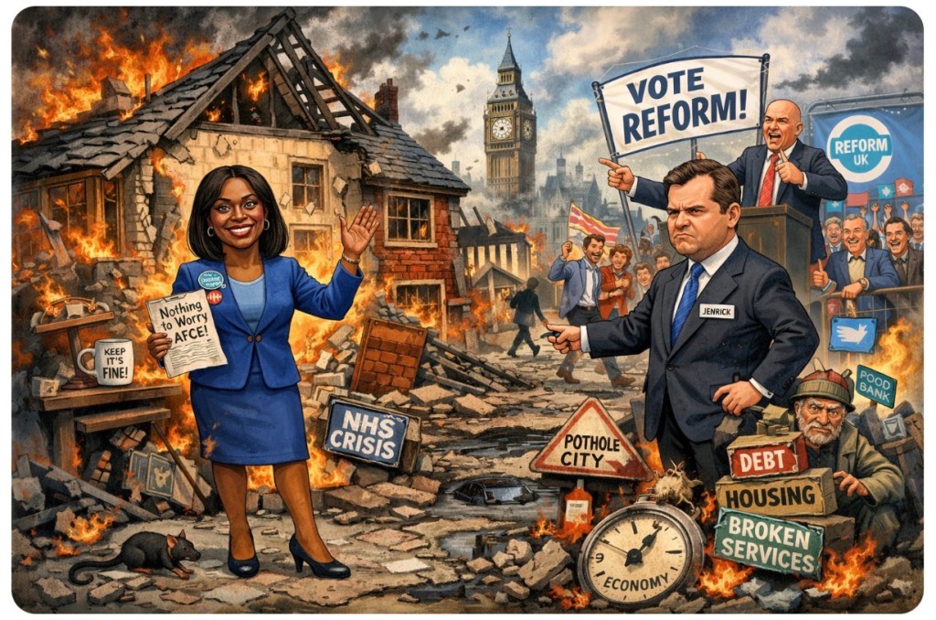 According to Kemi Badenoch, Britain is not broken. No, no—nothing to see here. The economy is merely “reimagined,” public services are doing avant-garde performance art, and the social contract has been replaced with a Post-it note reading “good luck.”