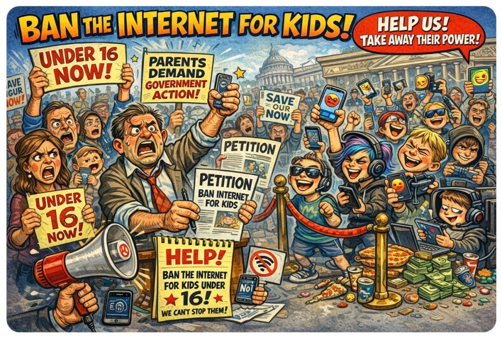 So what’s the solution? Simple! Don’t take away their phones. Don’t engage with your kids. Don’t, heaven forbid, parent. No, ban the internet entirely. Because if your twelve-year-old threatens to leak your Facebook messages one more time, you might just start drafting legislation yourself.
