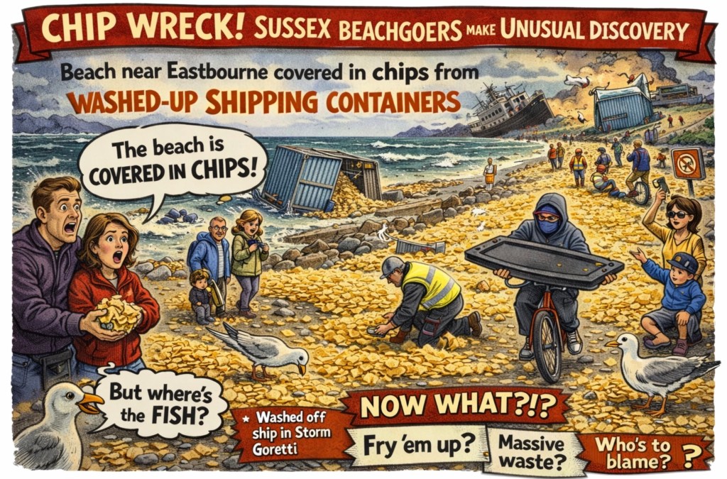 Thanks to Storm Goretti, a cargo vessel doing its best Titanic impression dumped several containers into the drink, and now the English Channel is serving up battered potatoes without the fish. Picture the scene: confused seagulls, delighted kids, and local pensioners arguing about whether itโs safe to put vinegar on flotsam food. A soggy apocalypse of McCain proportions.