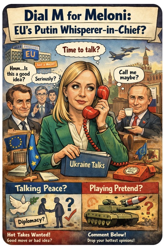 ☎️🇷🇺Italy’s Giorgia Meloni has dropped a diplomatic mic: she thinks the EU should cozy up—strategically, of course—for a little high-level chit-chat with none other than Vladimir Putin. Her pitch? Appoint a special EU envoy and reopen dialogue with Moscow to coordinate peace efforts on Ukraine. Because nothing says “unity” like a bloc of 27 nations nervously side-eyeing each other while someone volunteers to call the guy who started the war.